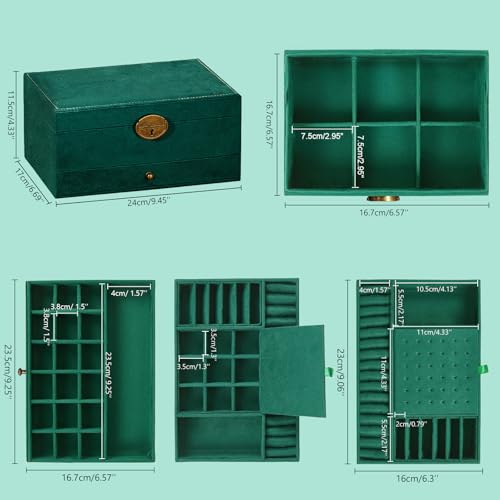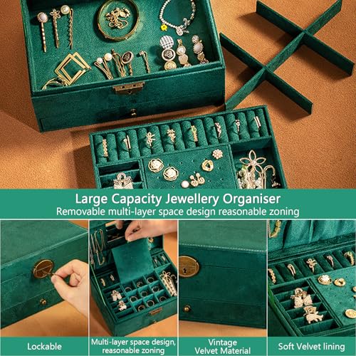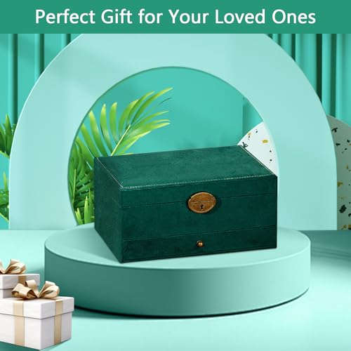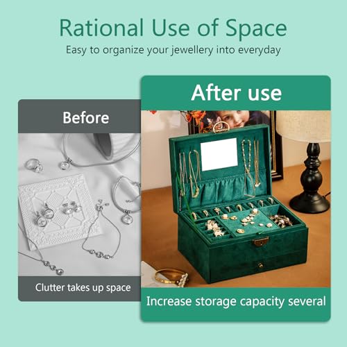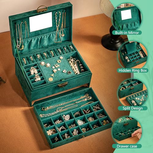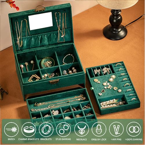 Ogrmar - صندوق منظم مجوهرات من 3 طبقات، صندوق مجوهرات مخملي بسعة كبيرة مع مراة، حافظة مجوهرات خضراء كبيرة للخواتم والاقراط والقلائد والاساور، حافظة تخزين منظم مجوهرات للبنات والنساء