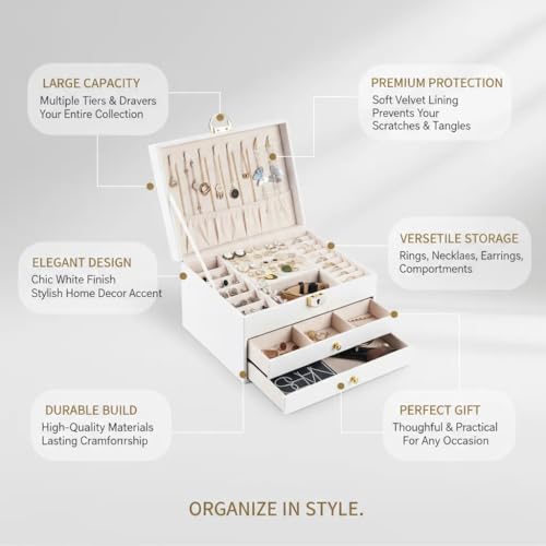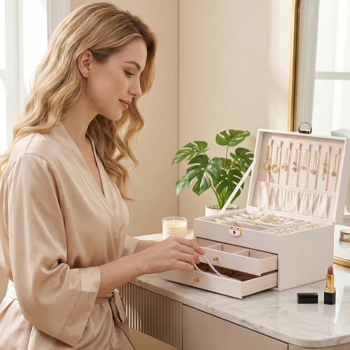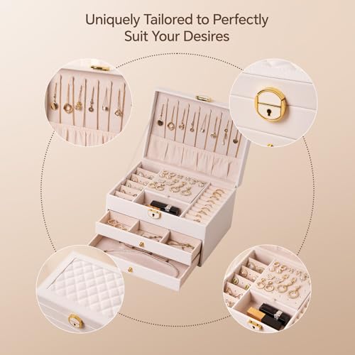 DOXINGKAI - 3 Layer Jewelry Box, Jewelry Holder Organizer with Jewelry Organizer Drawer, Large Jewelry Boxes & Organizer with Velvet Earring Organizer, Lockable Jewelry Holder, Unique Gifts for Women Mom (White)