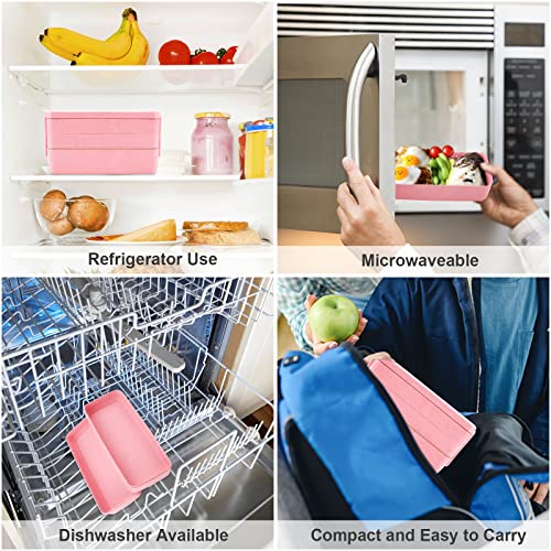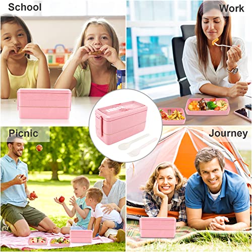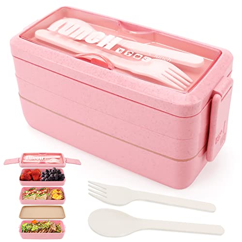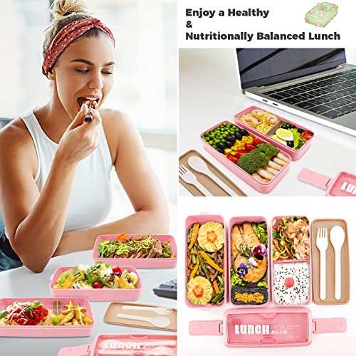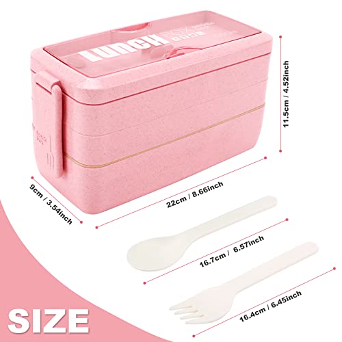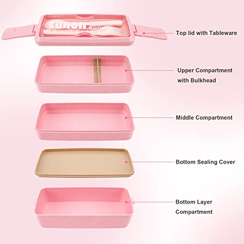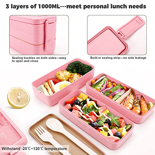 Yirochan - 3 Layer Lunch Box Bento Box for Adults, 4-in-1 Meal Prep Container with Fork & Spoon, 1000ml Food Storage Box for Men Women Student School Office, Microwave Dishwasher Safe Available (Pink)