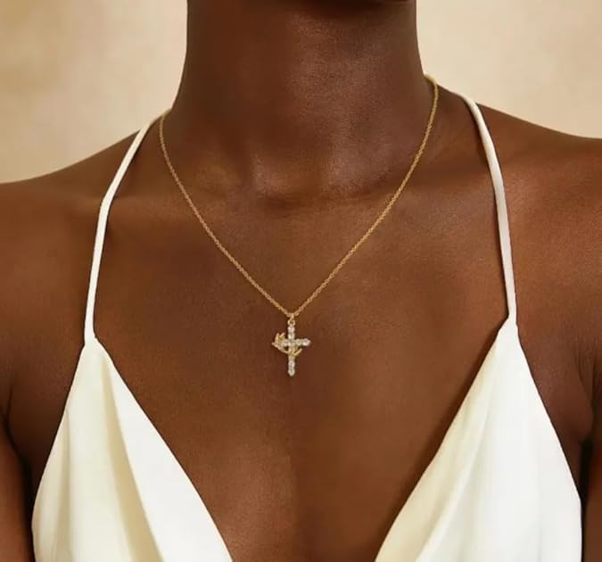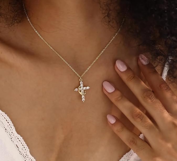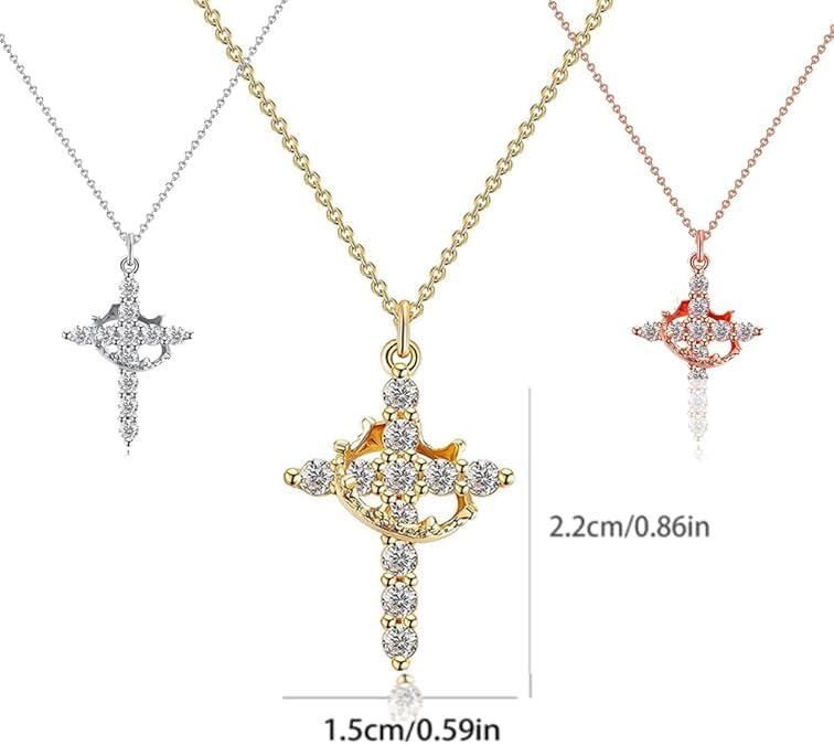 fashion mania - سلسلة أنيقة مرصعة بدلاية زركونيا على شكل صليب وتاج للنساء، عبوة 3 قطع