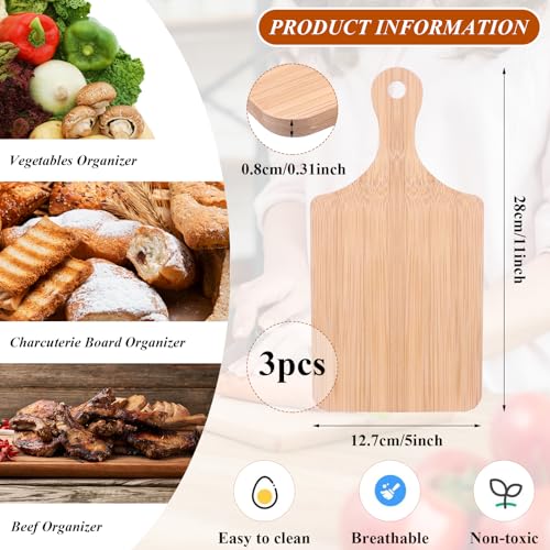 - Bamboo Cutting Boards: you will receive 3 pieces of bamboo cutting boards, Enough quantity can meet your diverse customization, serving or cutting needs. These bamboo kitchen butcher block measuring approx. 11x5x0.31 inch/28x12.7x0.8 cm, suitable for all kinds of cutting, chopping, you can use them for breads, cheeses, meats, vegetables, fruits, and pizzas, etc