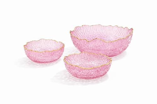 Generic - 3 PCS Glass Bowl Set with Gold Rim – Premium Textured Glass Serving Bowls for Salad, Fruit, Snacks & Desserts, Elegant Tableware for Kitchen, Dining, Parties & Home Use (Pink with Gold Rim)