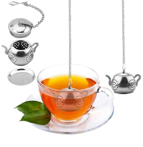 fashion mania - مصفاة شاي من الفولاذ المقاوم للصدأ قابلة لإعادة الاستخدام، على شكل إبريق شاي، مع سلسلة طويلة وقاعدة لمنع التنقيط