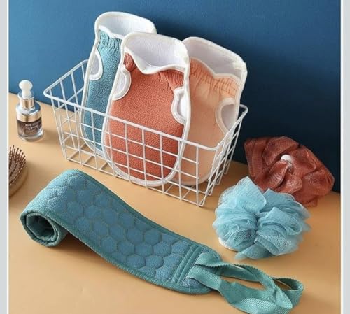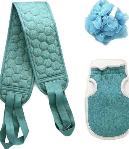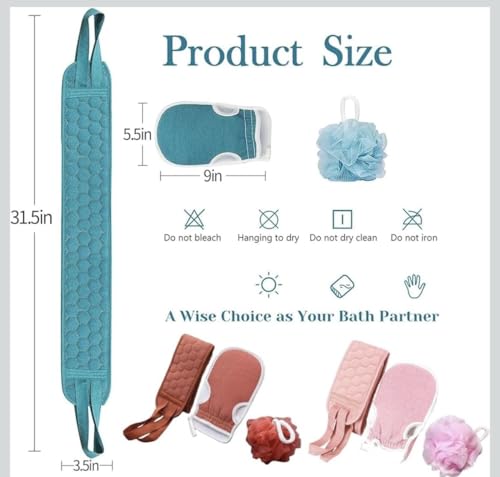 - COMPLETE BATH SET: includes 3 essential body care pieces - a long back brush, exfoliating mitt, and a soft sponge puff for a complete refreshing shower experience