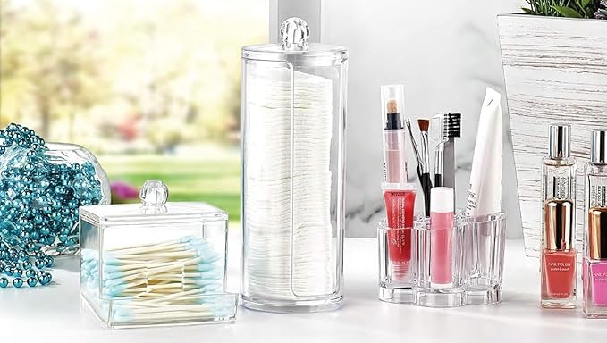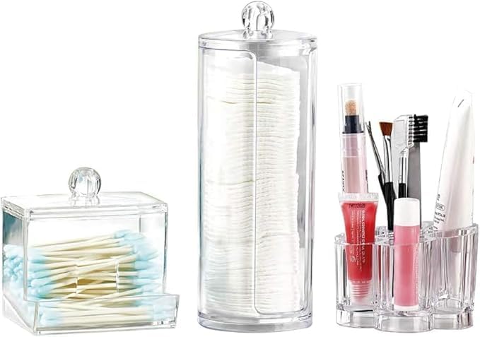 Generic - علب حمام أكريليك شفافة 3 قطع بتصميم عصري: حامل وسادات قطنية، حامل سدادات قطنية، ومنظم مكياج أنيق لتوفير المساحة وتنظيم أدوات التجميل، مثالية للحمام أو غرفة النوم
