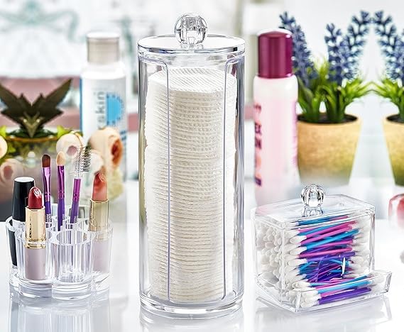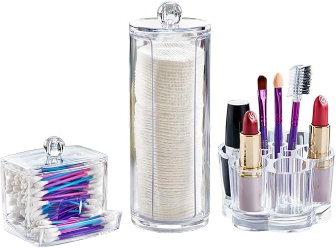 - ثلاث قطع متعددة الاستخدامات: المجموعة تضم: حامل وسادات قطنية لتخزين الوسادات القطنية بطريقة مرتبة وسهلة الاستخدام حامل سدادات قطنية مصمم لحفظ السدادات القطنية بشكل مرتب وحمايتها من الغبار منظم مكياج لتخزين الفرش ومستحضرات التجميل اليومية بشكل منظم