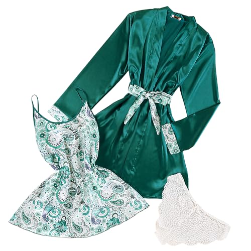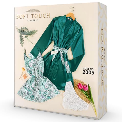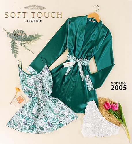 Soft Touch Lingerie - طقم لانجري ليلة الدخلة لانجري مكوّن من 3 قطع روب و أندر و توب بدون أكمام, روب قصير بيبي دول حرير فستان ناعم قميص نوم قصير للنساء - مقاس واحد من50كيلو إلى 80كيلو (NO:2005) (زيتي)