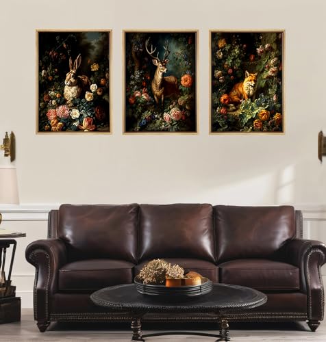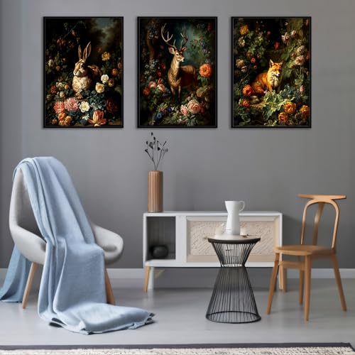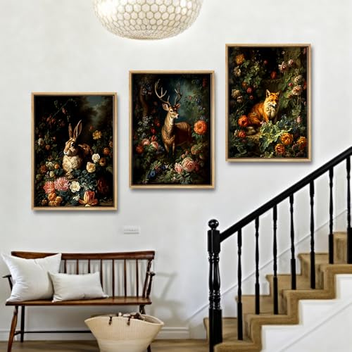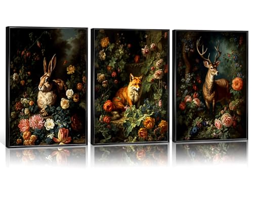 SHVCHBK - 3 piece wall art Set Forest Animal Fox Elk rabbit Canvas Posters Prints Victorian Gothic Botanical Floral wall art for living room Bedroom Decor Retro Plant Oil Paintings Prints Unframed 12x16in