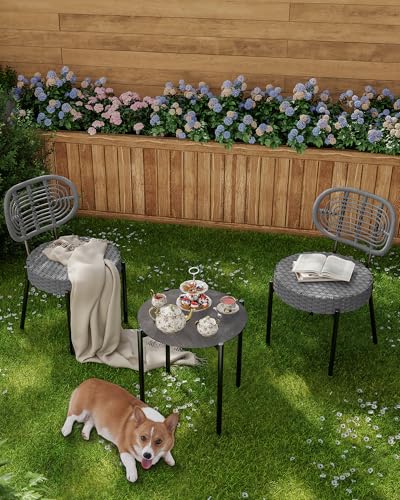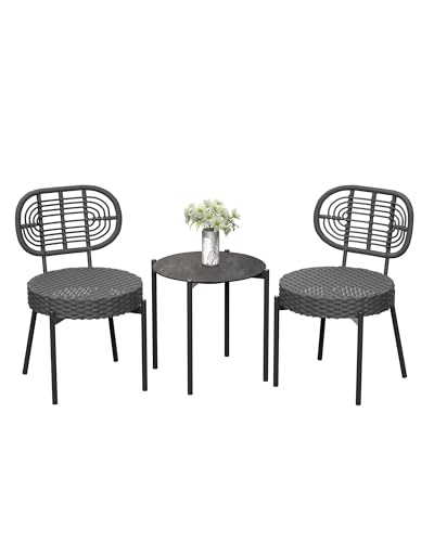 GarveeLife - 3 Piece Wicker Patio Bistro Furniture Set, Outdoor Dining Chairs, Includes 2 Rattan Chairs and Tempered Glass Table, for Garden, Backyard, Balcony, Apartment, Black & Grey
