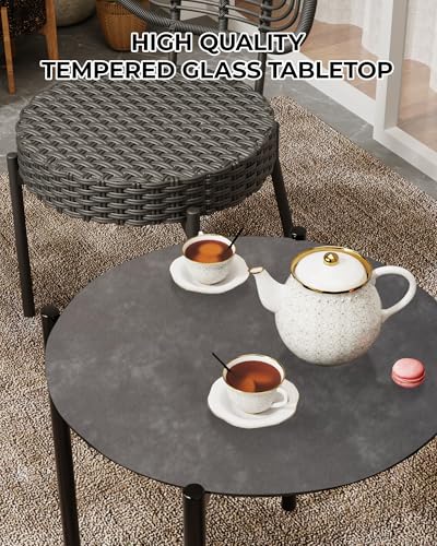 - Natural Patterned Glass Table: The included side table perfectly complements your patio wicker chairs with a clear tempered glass top that gleams beautifully and is easy to clean. It’s sturdy enough to hold food, drinks, books, or decor, making it both a decorative and practical centerpiece for your outdoor gathering