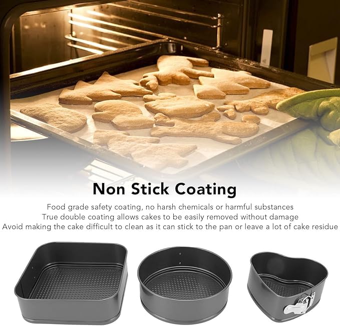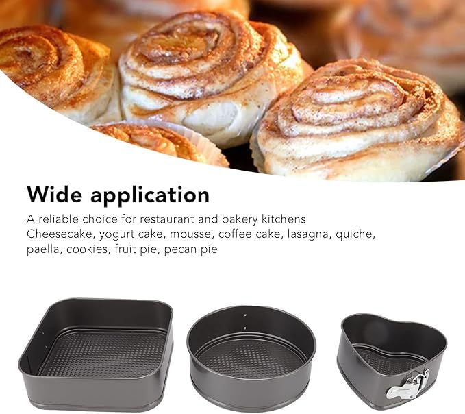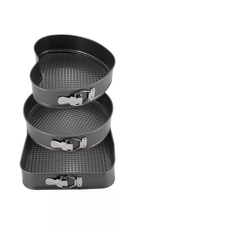 - طقم متنوع: يتضمن 3 صواني سبرينج فورم بأشكال مختلفة (قلب، دائرية، مربعة) بمقاسات 24 سم، 26 سم، و28 سم لتلبية احتياجات الخبز المتنوعة
