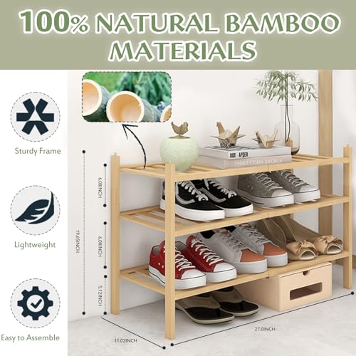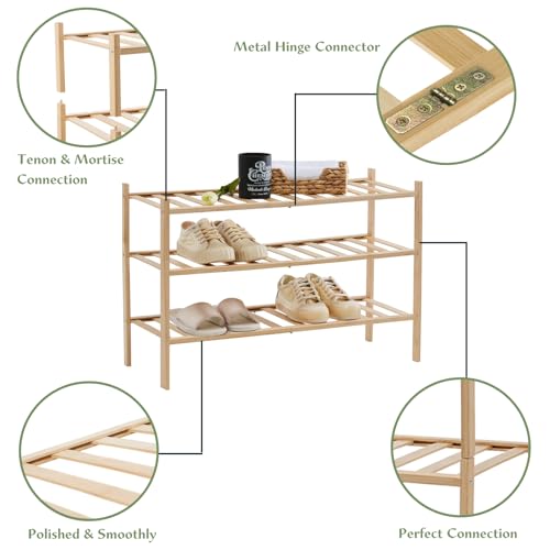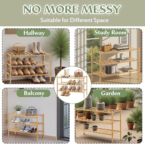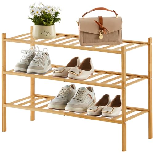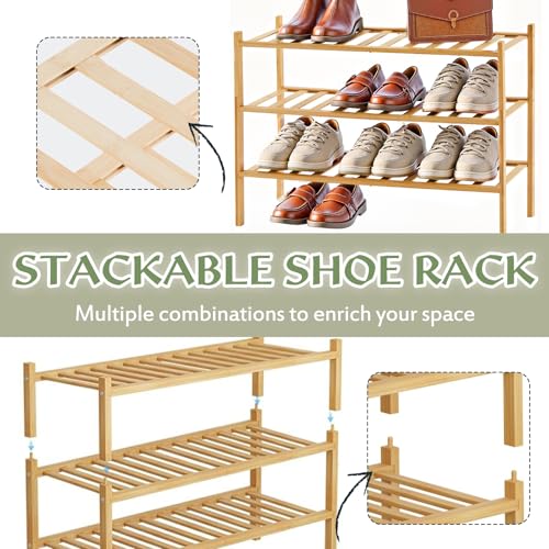 - 【Stackable & Space-Saving Design】This 3-tier bamboo shoe rack features a modular, stackable design, allowing you to customize storage height by combining units . Perfect for small spaces like closets, entryways, or bathrooms, its compact footprint maximizes vertical storage without crowding.