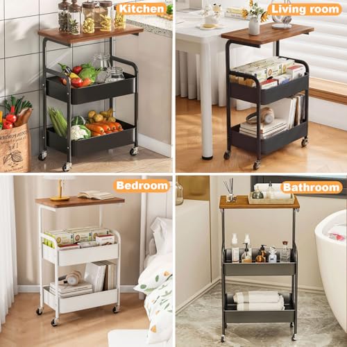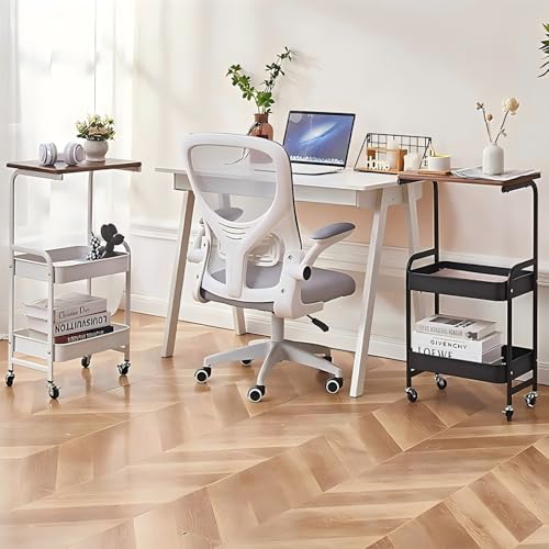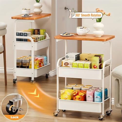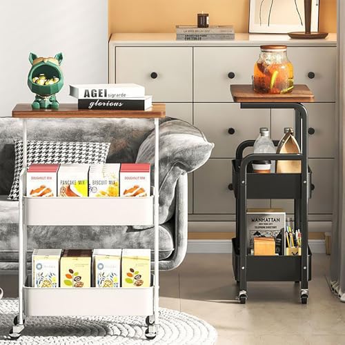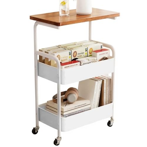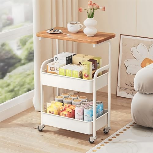 YiYunun - عربة تخزين معدنية دوارة من 3 طبقات، عربة تخزين عملية مع سلال شبكية خشبية لسطح الطاولة، منظم عجلات للمكتب وغرفة المعيشة والمطبخ والحمام والمراب وحامل جانبي وطاولة كنبة (ابيض)