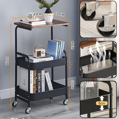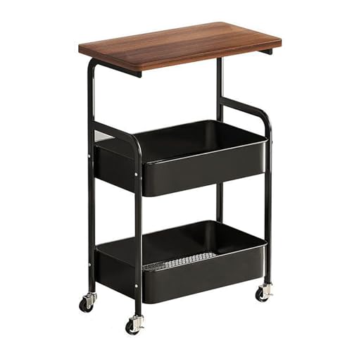 YiYunun - 3 Tier Metal Rolling Utility Cart Functional Storage Trolley with Wooden Tabletop Mesh Baskets Wheels Organizer for Office Living Room Kitchen Bathroom Garage Tray Small Side Stand End Sofa Table