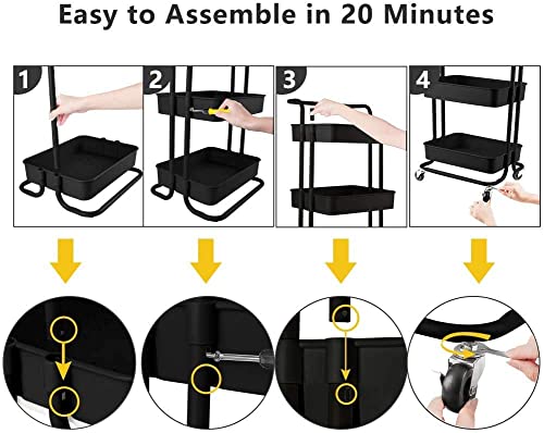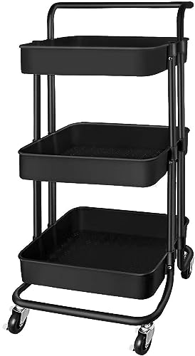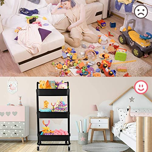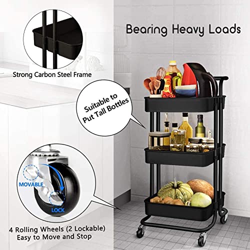 YumLock - 3 Tier Rolling Storage Cart with Wheels Handle, Heavy Duty Mobile Rolling Utility Cart Multifunction Large Storage Shelves Organizer with Mesh Basket for Kitchen, Bathroom, Bedroom, Office, Black
