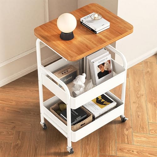 skisopet - 3 Tier Utility Cart Organizer with Wooden Tabletop,Thickened Metal Carts with Silent Swivel Casters Brakeable Mesh Basket Ventilation Design for Kitchen,Bathroom,Living Room,Office (White)