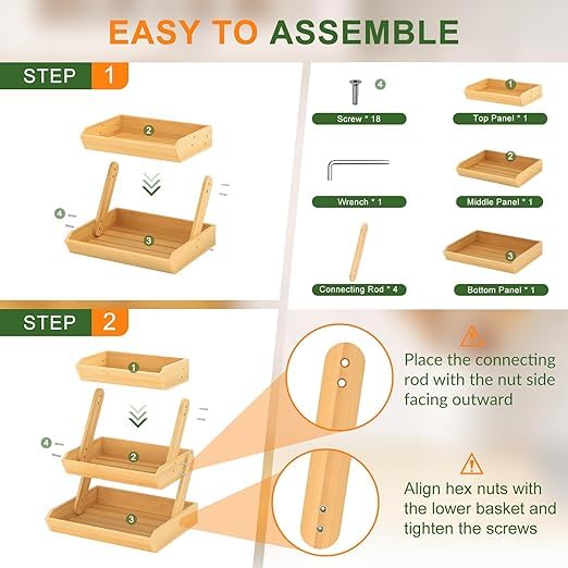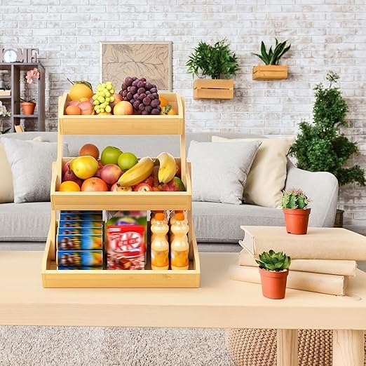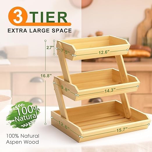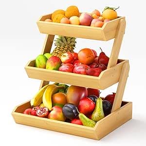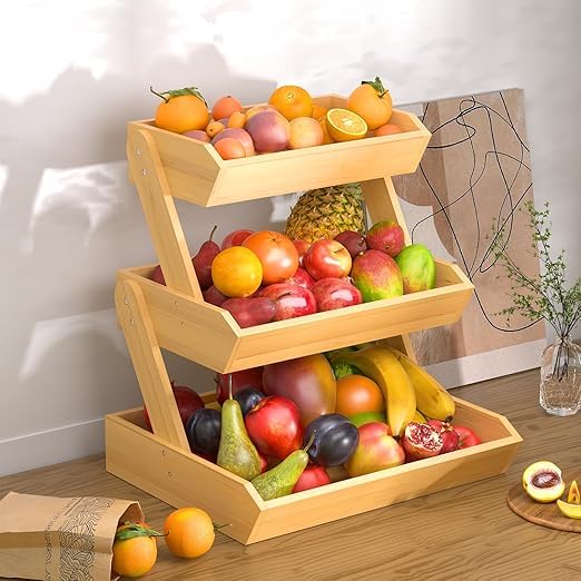- DESIGN: Three-tier wooden fruit basket with stepped design provides easy visibility and access to all stored items while maximising counter space
