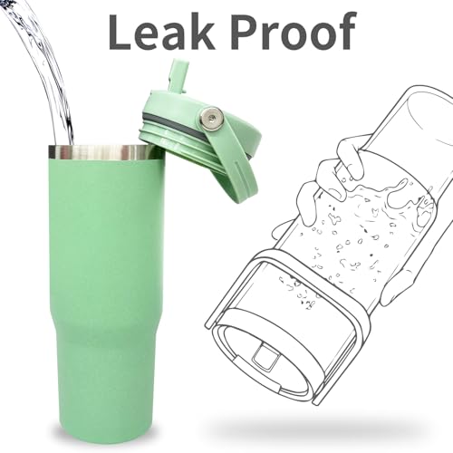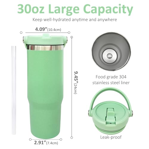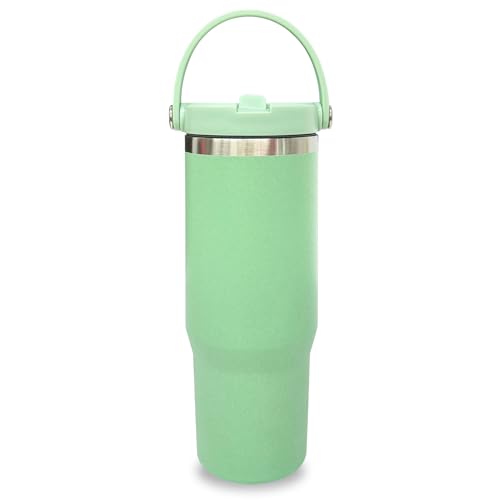 FunTrans - كوب مع مقبض علوي، كوب معزول بتفريغ الهواء وجدار مزدوج بشفاطة علوية قلابة، مج قهوة مطلي بمسحوق للنقش بالليزر، 887 مل (أخضر، 1/ العبوة)