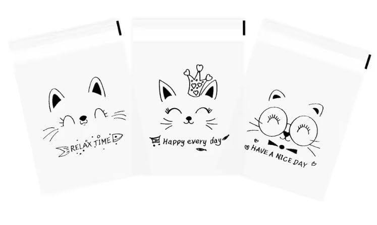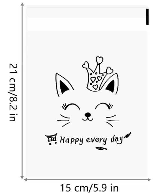 - تصميم جذاب: أكياس شفافة مزينة برسومات قطط لطيفة مع عبارات محفزة مثل 'وقت الاسترخاء' و'يوم سعيد'