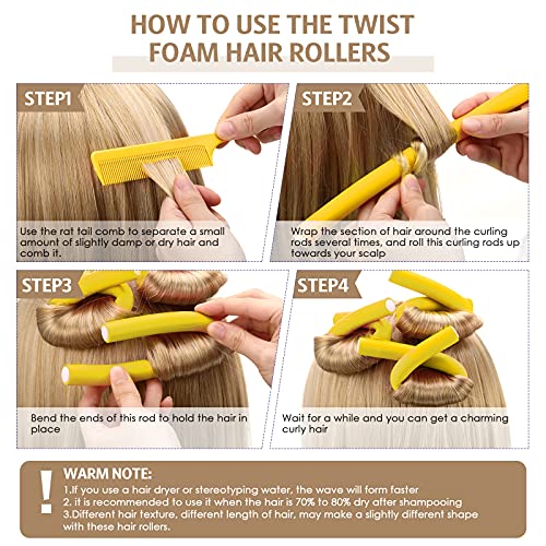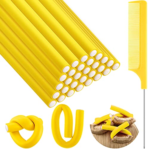 Syhood - 30 Pieces Flexible Curling Rods Twist Foam Hair Rollers Soft Foam No Heat Hair Rods Rollers and 1 Steel Pintail Comb Rat Tail Comb for Women Girls Long and Short Hair (7 x 0.6 Inch, Yellow)