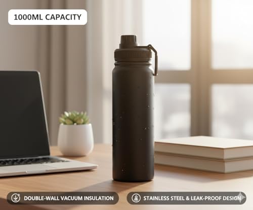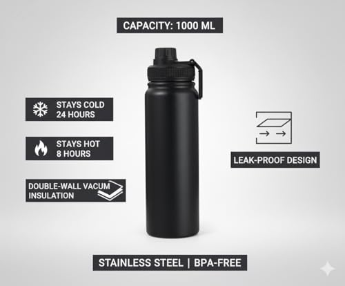 Generic - 304 Stainless Steel Water Bottle 1000ml - Double Wall Vacuum Insulated Water Bottle for Hot and Cold - Tea Infuser & Carry Handle - Black