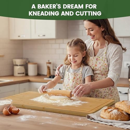 - 【مقاس كبير】يوفر لوح التقطيع المصنوع من الخيزران الضخم مقاس 91 × 61 سم مساحة كبيرة على سطح الطاولة لإعداد مكونات متعددة في وقت واحد وتحسين كفاءة الطهي، مثالي للوجبات الكبيرة والتجمعات العائلية.