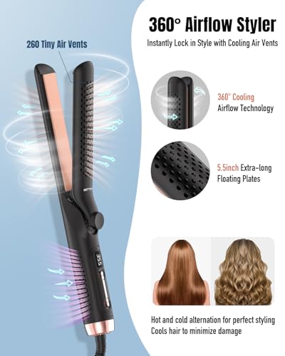 HITTIONA - 360° Airflow Styler Curling Iron - 1.25 Inch Hair Straightener and Curler 2 in 1 with Vented Cool Air to Lock in Style, Extra Long Flat Iron Curling Wand, 5 Temps & Dual Voltage for Travel