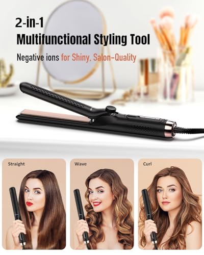 - 2 in1 360° airflow styler - This hair straightener and curler 2 in1 combines the functionality of a extra long flat iron and a curling iron, allowing you to create sleek straight styles or bouncycurls, beach waves effortlessly. Negative ions technology to keep hair shiny, smooth and frizzfree. Nice for all hair types and styles.