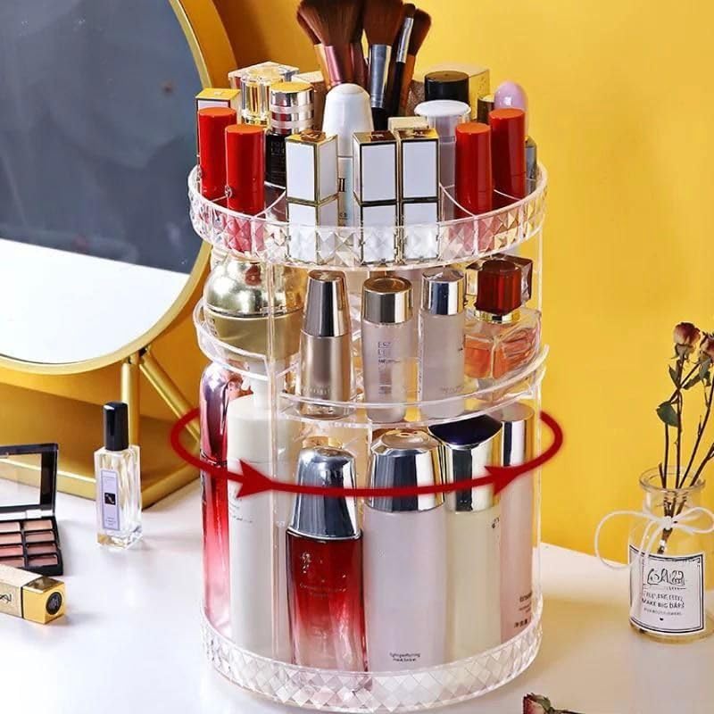 • منظم مكياج ثلاثي الأدوار بتصميم دوار 360 درجة لسهولة الوصول لكل أدواتك.