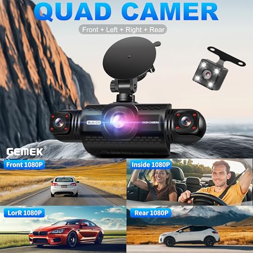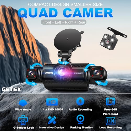 GEMEK - كاميرا سيارة 4 قنوات بزاوية رؤية 360 درجة أمامي وخلفي وداخلي ويسار ويمين من جميك، بدقة FHD 1080P، وبطاقة ذاكرة تي اف 64 جيجا، كاميرا متعددة القنوات برؤية ليلية ووضع مراقبة أثناء الوقوف لمدة 24 ساعة