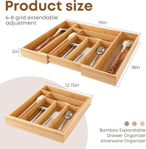- [ Expandable and Adjustable Utensil Organizer ] - Designed with 6-8 compartments, the silverware organizer can save space while accommodating multiple items, which is expandable from 12.91 inches to 19.69 inches wide with smooth sliding.