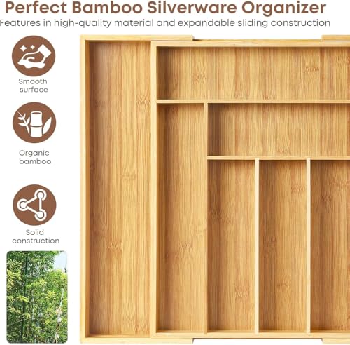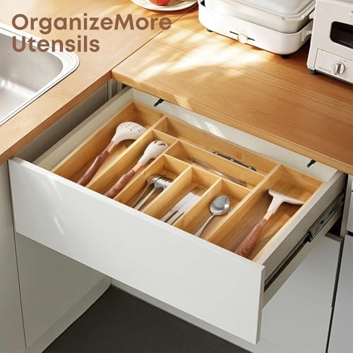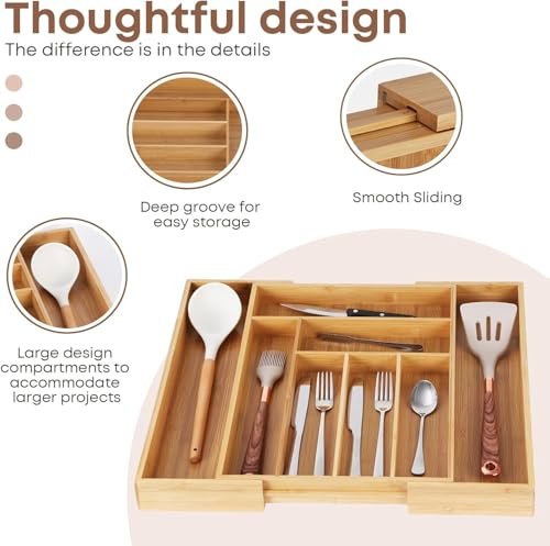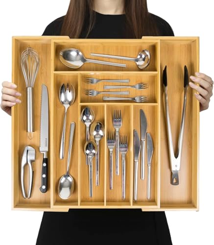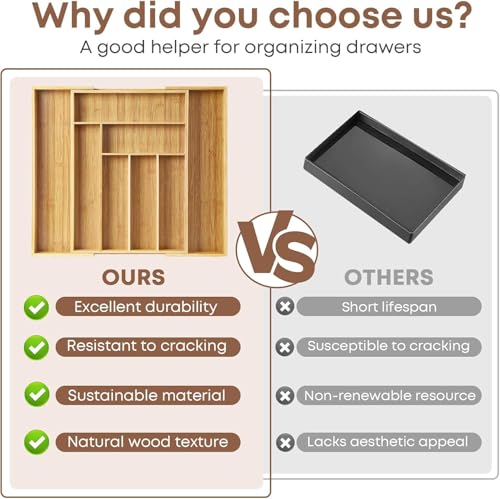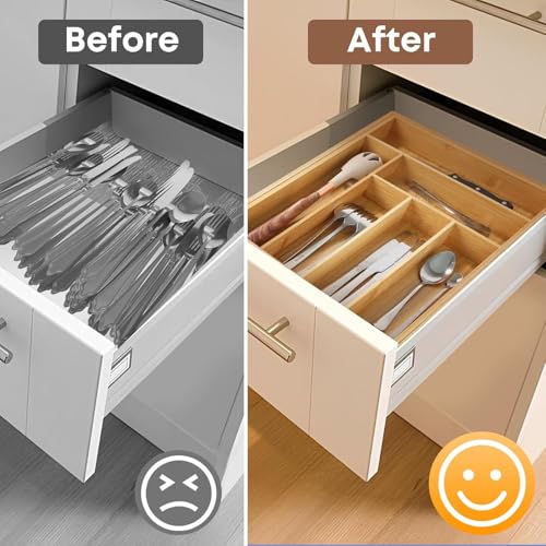 - [ Sturdy Construction and Easy Maintenance ] - This kitchen utensils drawer organizer is sturdy enough to store in place. This bamboo organizer can be wiped quickly with warm water and simply wiped down with a damp cloth.
