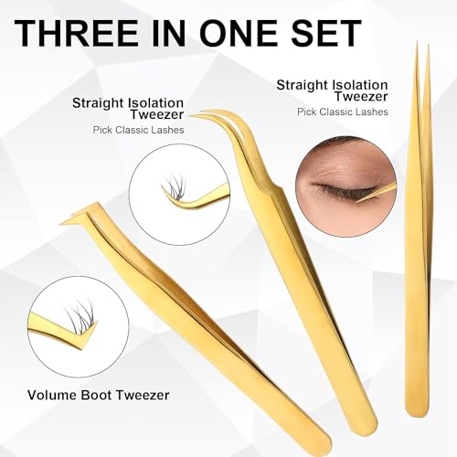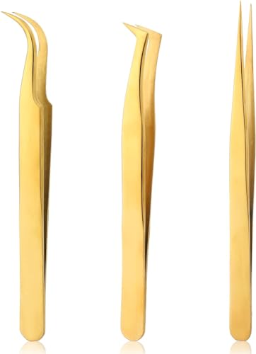 Risprsulen - 3Pcs Gold Lash Tweezers Set Stainless Steel Eyelash Tweezers Lash Extension Tweezers Lash Applicator Tool Craft Tweezers for Cluster Lashes, Jewelry Making, Craft, Electronics