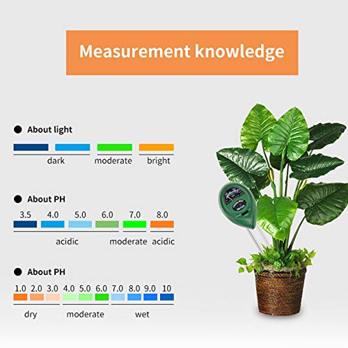 - [Soil Tester] It let you know when to water, control the pH value, and determine whether the plants have enough light. 1-10 (dry to wet); lighting range: 0-2000 (weak light to strong light); pH range: 3.5-8 (acid to alkaline).