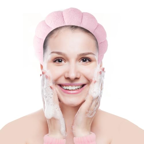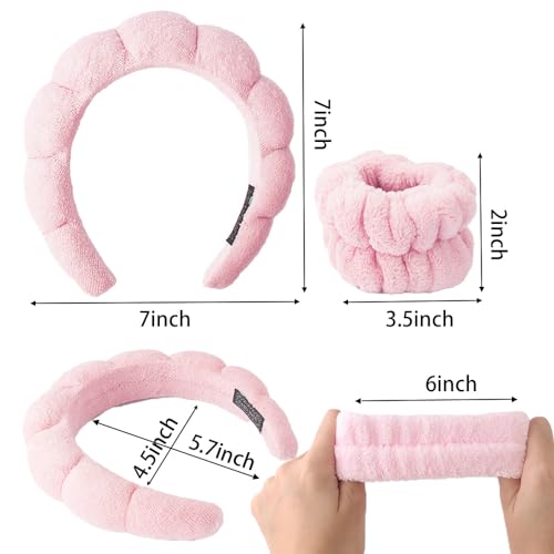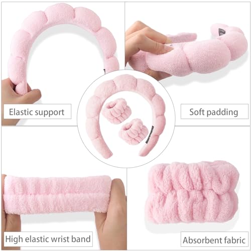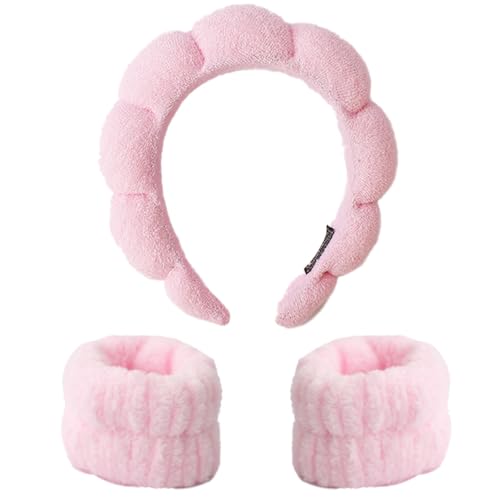 Oasisgalore - مجموعة من 3 قطع من طوق الرأس وأساور معصم، طوق رأس إسفنجي لغسل الوجه، طوق رأس ناعم ومنتفخ ومبطن للعناية بالبشرة والمكياج للنساء والفتيات، وردي