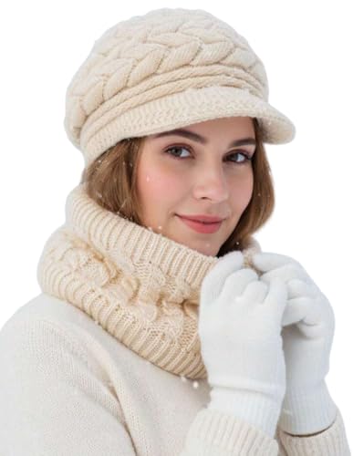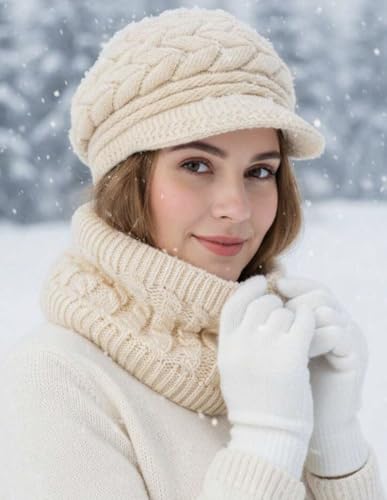 Generic - 3Piece Winter Knitted Set with Fleece Lined Hat, Neck Warmer and Gloves, Beige Cable Knit Ski Cap Set
