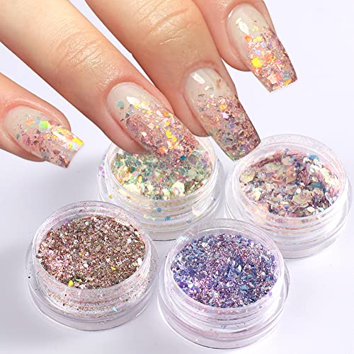BSBTBZ - 4 Boxes Holographic Nail Glitters,3D Sparkly Mermaid Nail Glitter Flakes Set Shiny Acrylic Nails Powder Dust Sequins for Crafts, Body Glitter, Face Glitter Nail Art Supplies Glitter for Acrylic Nails