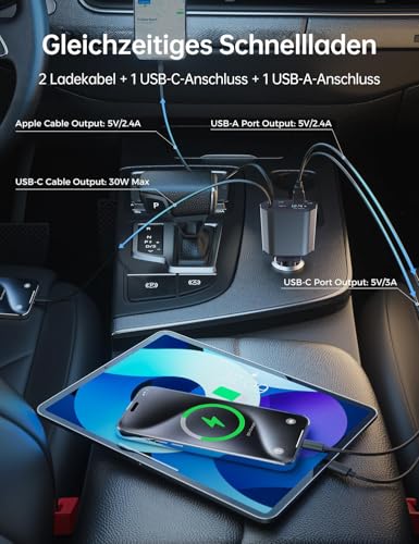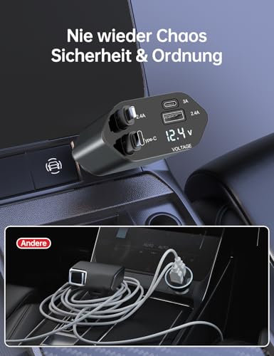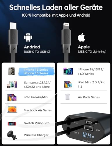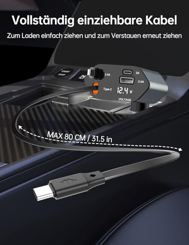 - Retractable design: cigarette lighter USB C – no more cable chaos! The automatically retractable USB C and iPhone cable automatically retracts after use. So your car will always stay tidy and the cables are protected from wear and tear - no tangled cables, just full power.