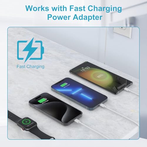 Poukey - شاحن اي ووتش 4 في 2 لكابل شاحن ساعة آبل، شاحن آيفون وساعة آبل اي ووتش 9/8/7/6/SE/الترا، آيفون 16 15 14 13، أندرويد، شحن مغناطيسي لاسلكي 2.5 وات، شاحن سريع لساعة آبل
