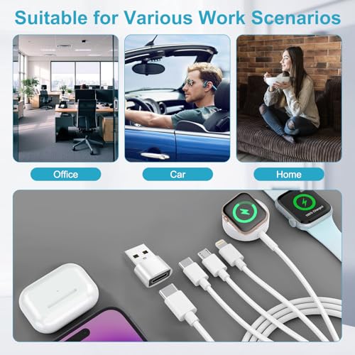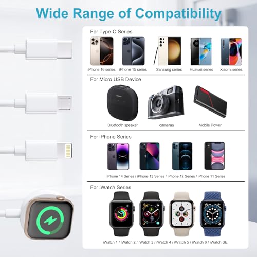 - محمول ومتين لشاحن ساعة آبل تقنية الشحن السريع: هذا التصميم البسيط لشاحن ساعة آبل بمنفذ USB نوع سي خفيف الوزن وسهل الحمل، بطول 1 م مناسب للمكتب وغرفة النوم والسفر والسيارة والعديد من السيناريوهات الأخرى. كابل واحد يدمج منافذ USB نوع سي ولايتنينغ وMicro USB واي ووتش لتلبية احتياجات الشحن لأجهزة متعددة.