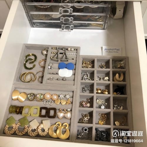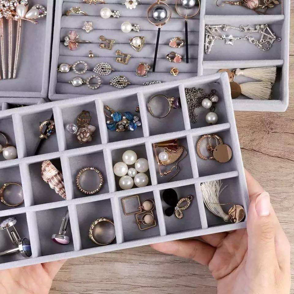 - 【SOFT TOUCH AND STYLISH LOOK】- Our jewelry display organizer tray is made of durable composite board and covered with luxurious plush fabric that provides a soft texture and elegant appearance, reliable and durable for long time use. It is grey and fits perfectly with any jewelry style, and stands out easily among other jewelry boxes.
