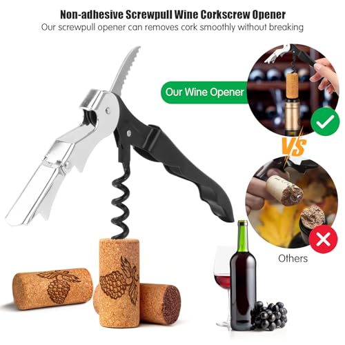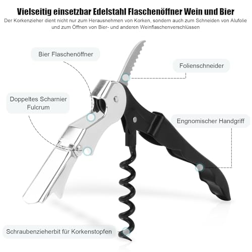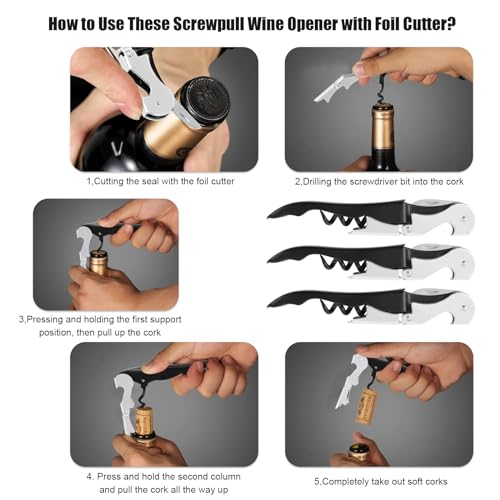 - فتاحة زجاجات نبيذ عالية الجودة: فتاحة زجاجات سكين الفلين مصنوعة من الفولاذ المقاوم للصدأ عالي الجودة، وهو قوة شد قوية وقوية ومتينة. كما أن فتاحات الزجاجات اللولبية عملية كلفانية، وتشكل منظرًا سلسًا وجميلًا وكلاسيكيًا، ومناسبة جدًا للاستخدام المنزلي والقفل والقضيب وما إلى ذلك. كما أن مفك البراغي لسكين النادل يحتوي على 5 دوائر مصنوعة من الفولاذ المقاوم للصدأ ، وهو صلب وطويل بما يكفي لإدخال وإزالة الفلين بالكامل