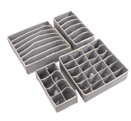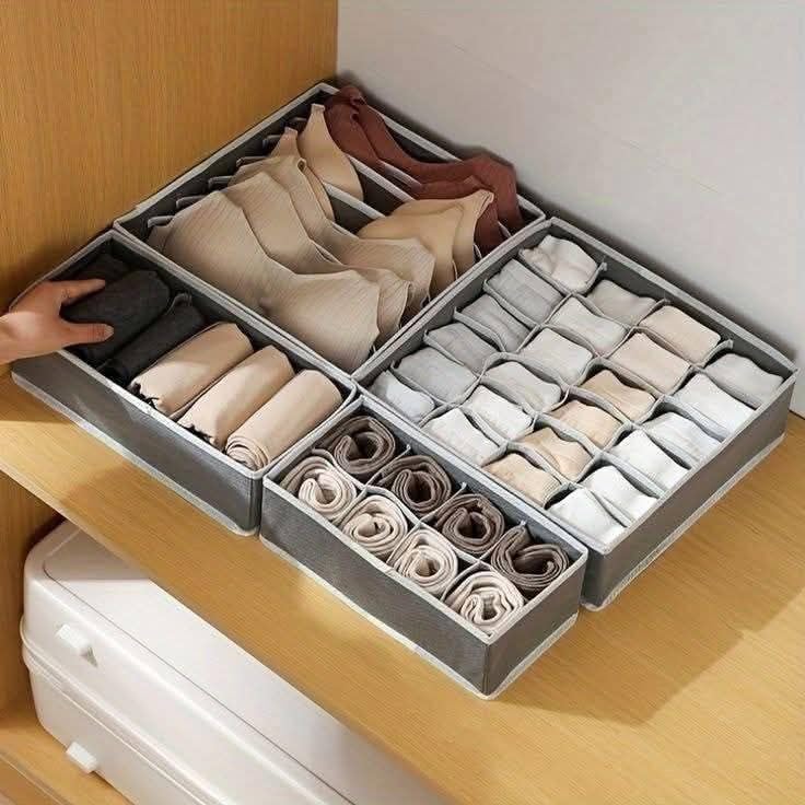 - طقم مكون من 4 قطع منفصلة: كل قطعة مخصصة لترتيب نوع معين من الملابس الداخلية والشرابات والقطع الصغيرة، لتسهيل الوصول والتنظيم بدون تشابك.