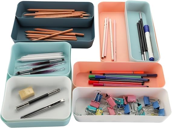 - Customized Layout in Different Sizes: The interlocking feature of the bins helps you create your own mix and match organizational system to fit in any drawer. These sturdy desk organizer trays can be stacked together, or each one works alone.