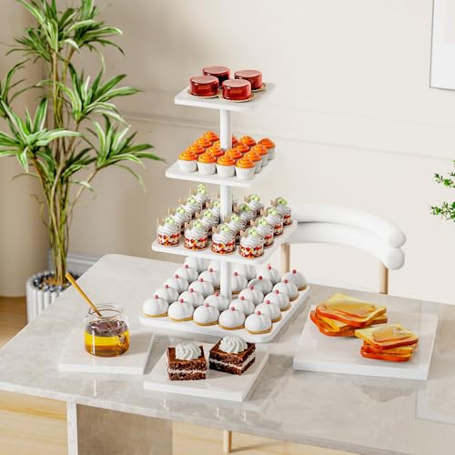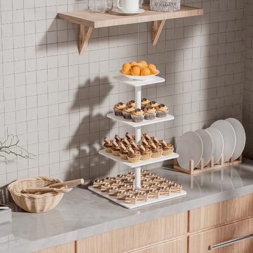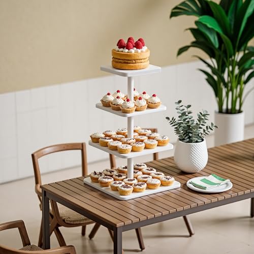 - مادة خشب ليفي متوسط الكثافة آمنة وعالية الجودة: حامل الكب كيك المربع المكون من 4 طبقات مصنوع من خشب ليفي متوسط الكثافة الفاخر، مما يضمن متانة فائقة وسطح أملس خالٍ من الشظايا. مطلية بطلاء آمن غذائيًا لسهولة التنظيف، وهي مثالية لعرض حلوياتك بأناقة وعملية.