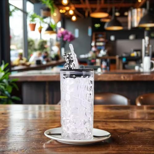 Bedaya - 400ml Glass Tumbler with Black Lid and Straw, Metal Bear Design, for Cold Drinks, Tea