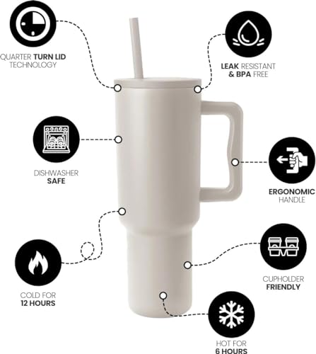 - 【Portable 40Oz Tumbler with Handle and Lid】: The tumbler can be safely placed in most car cup holders, and it is more convenient and lightweight to use with the handle. Whether you're driving to work or running errands, the tapered slim-base design of our insulated coffee mug allows it to fit perfectly in most cupholders, so you can keep your favorite drinks close at hand while you're on the go, and the wide and thick ergonomic handle is more convenient and lightweight to hold.