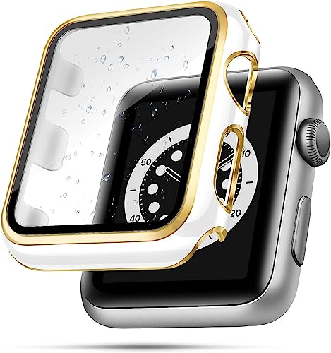 Generic - 44mm PC Case with Built-in Tempered Glass Screen Protector Compatible with iWatch Series 8/7/SE 6 5 4/3/2 for Choice (44mm, White with Gold Edge)