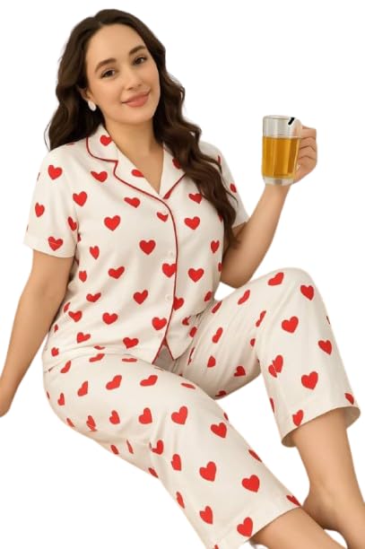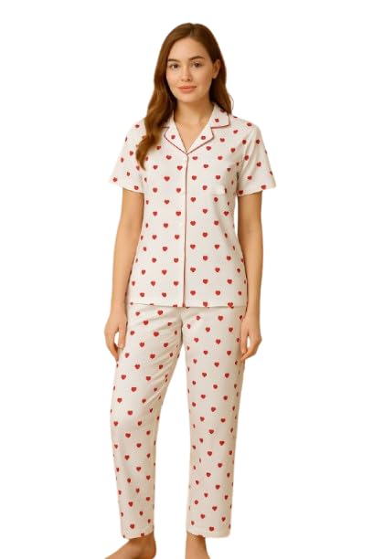 Generic - بيجامة نسائية صيفي قطعتين زر - أبيض برسومات قلب أحمر - الخامه قطن ليكرا شعر مطبوع - صنف رقم #: 499-770