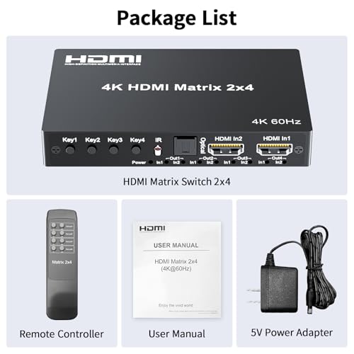 - محتويات العبوة: 2 × 4 محول تبديل مصفوفي اتش دي ام اي، 1 × شاحن طاقة، 1 × كابل USB، 1× جهاز تحكم عن بعد بالأشعة تحت الحمراء، 1 × دليل المستخدم.